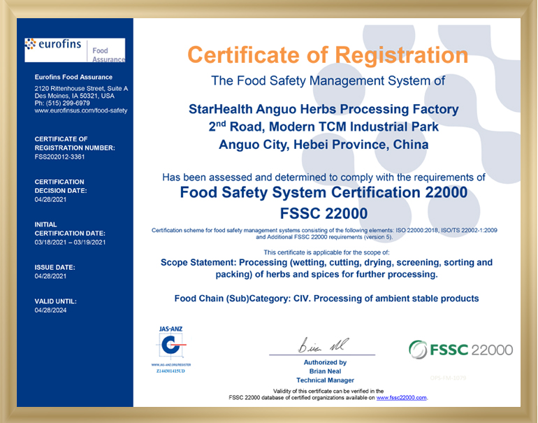 經過半年多的緊張準備工作,2021年4月28日辰風集團下屬工廠------安國辰風中藥材經營有限公司獲得了由第三方認證機構歐陸集團(Eurofins)頒發(fā)的FSSC22000食品安全體系認證證書,標志著公司質量體系建設邁上了新臺階。